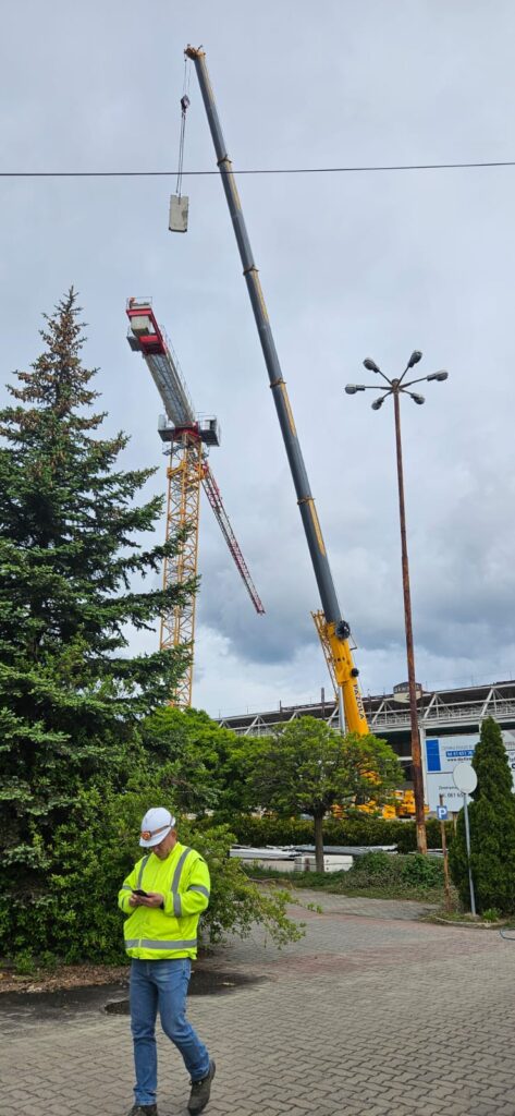 Specjalistyczny żuraw pozwala na podnoszenie elementów na wysokość 36 metrów, a jego ramię o zasięgu 65 metrów umożliwi precyzyjne operowanie ładunkami na całej powierzchni pływalni. Maszyna posiada udźwig do 10 ton, a na końcu długiego ramienia jest w stanie bezpiecznie transportować elementy o masie do 2 ton.