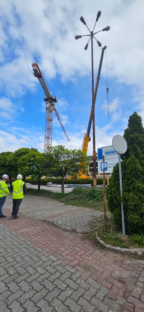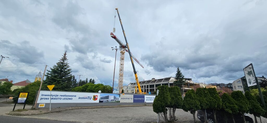 Prace modernizacyjne na terenie pływalni Akwawit w Lesznie wchodzą w nową, kluczową fazę. Na placu budowy trwa właśnie montaż dużego dźwigu obrotowego – żurawia Liebherr 202 EC-B 10, który odegra istotną rolę w demontażu starej konstrukcji dachu obiektu.