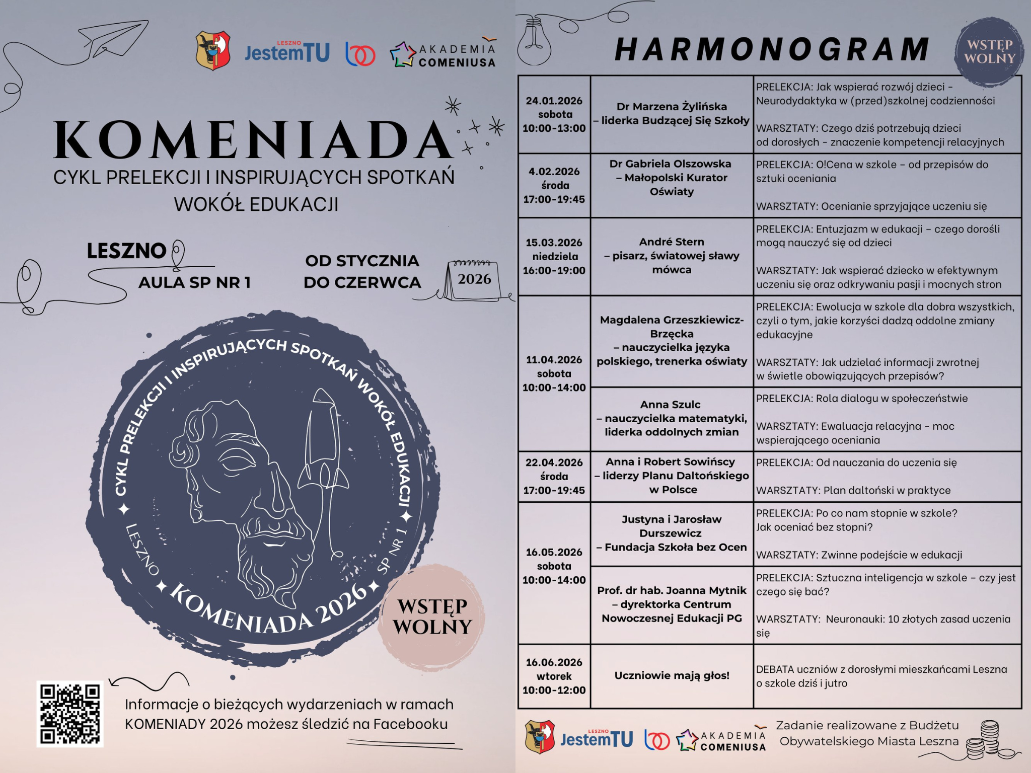 W ramach KOMENIADY 2026 zaplanowano osiem wydarzeń odbywających się od stycznia do czerwca. Wśród zaproszonych prelegentów znajdują się eksperci od nowoczensej edukacji z całej Polski, a także gość specjalny z Francji – André Stern, światowej sławy pisarz i mówca, promujący entuzjazm w edukacji.